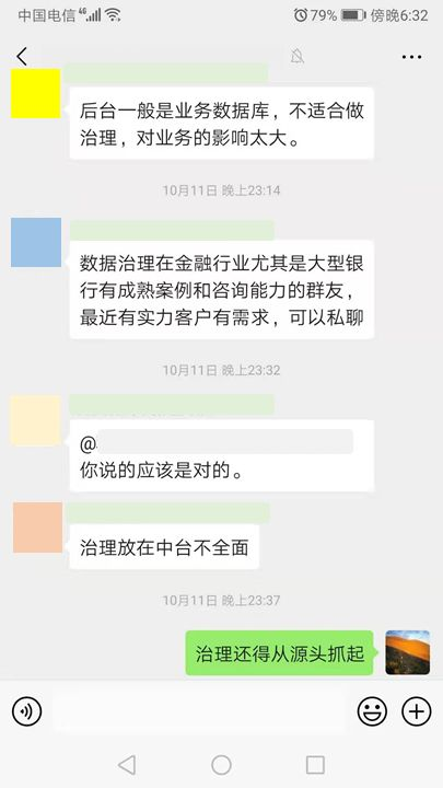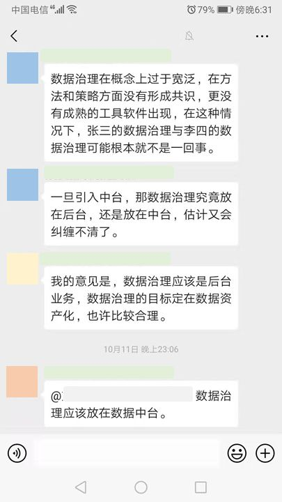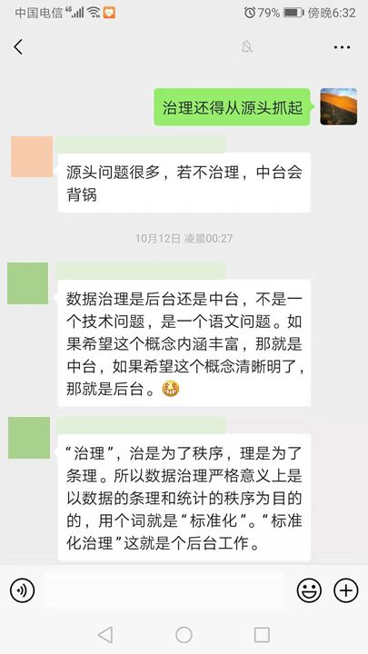 关于数据中台到底应该在中台治理还是应该在后台治理,,这个话题在笔者所在的数据圈子中引起了激烈的讨论。。。。群里参与讨论的都是业界的大咖,,,讨论内容也十分精彩,,我截了部分的截图,,,先看看大咖们的观点: