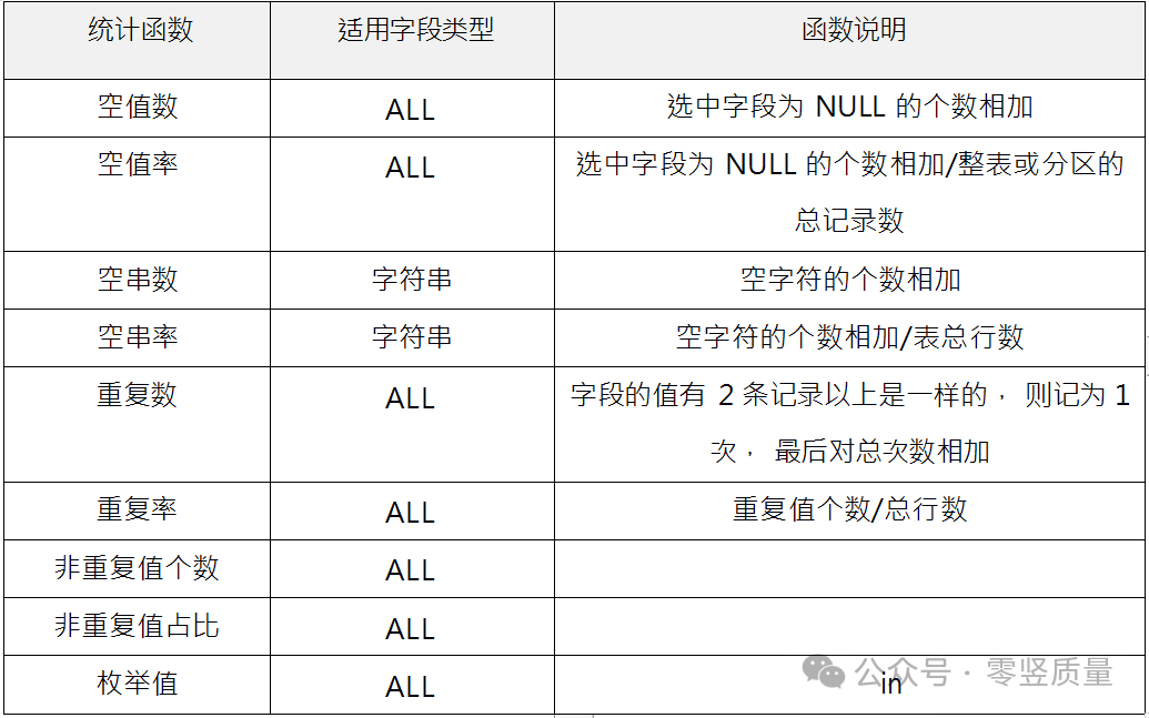 2、、、完整性的另一部分是字段的数据缺失,,,,可以通过统计字段的空值率进行校验。。比如默写字段在表中理论上是必然存在的,,数据中如果出现了空值,,,则说明该字段的数据缺失。。。。