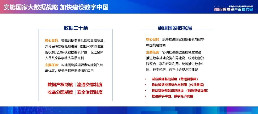 国家层面,,数据相关战略布局不断加强。。。。2022年6月“数据二十条”发布,,,对数据要素未来的基础制度建设做出了重要布局,,提出要构建数据产权、、、交易流通、、、收益分配、、、安全治理等制度体系。。其核心目的是提高数据要素供给数量和质量,,充分保障数据处理者使用数据和获得收益的权利,,充分实现数据要素价值、、、、促进全体人民共享数字经济发展红利。。。2023年10月,,,国家数据局正式挂牌成立,,统筹推进国家数据要素与数字中国战略协同发展,,核心任务一是推动数据基础制度建设,,发挥数据要素乘数效应;二是推动数据资源整合与利用,,充分激活数据要素潜能;三是统筹推动数据基础设施建设,,,,持续繁荣数据要素产业生态;四是推进数字中国和数字经济发展,,,,做大做强做优数字经济。。。