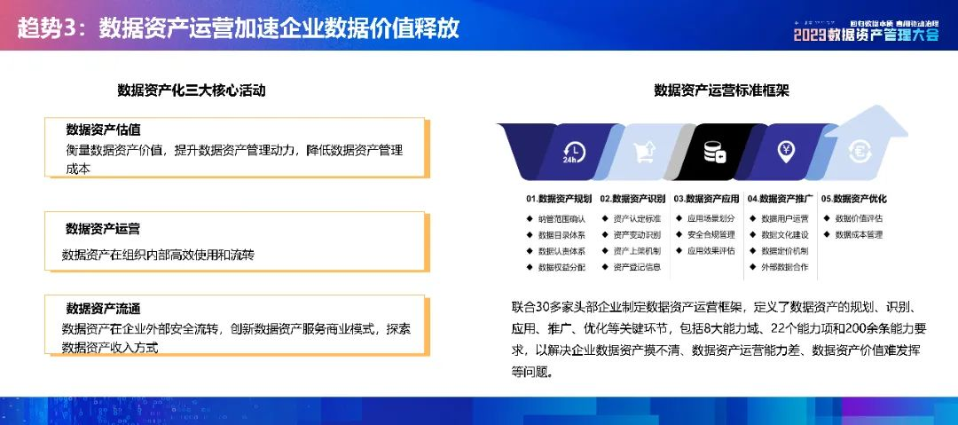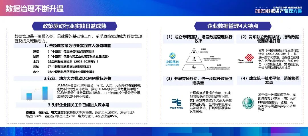 数据治理的目的是数据的可得、、、可用、、、、好用,,,释放数据价值,,,,最终实现数据驱动的企业运营。。只有通过对数据科学治理,,,,数据在企业内部的流动才具有意义,,,,不同维度的数据汇聚在一起,,,,才能创造新的价值。。头部企业的数据管理工作已进入深水区,,企业数据管理呈现4大趋势。。一是大量企业开始成立专职团队,,,,增强数据管理执行效率;二是发布独立数据战略,,,,推动数据管理精准开展;三是开展专项行动,,,进一步提升数据供给质量。。。四是建立统一技术平台,,消除协同难点。。。。接下来将分享数据治理领域的六个趋势:
