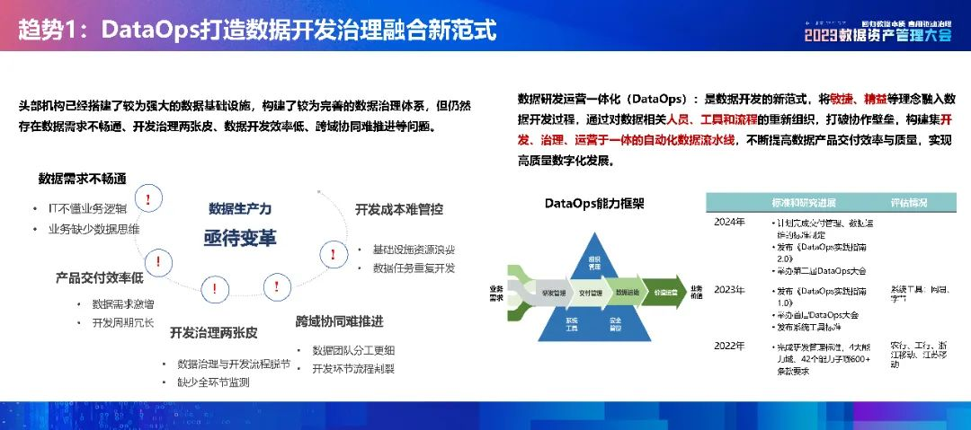 数据管理与数据开发的融合在加速,,新的数据开发范式正在形成。。。数据开发能力是企业数据生产力的核心,,,,大型银行、、、、大型运营商已经构建了较为强大的数据治理体系,,,但仍然存在数据需求不畅通、、、、开发治理两张皮、、、、数据开发效率低、、、、跨域协同难推进等问题。。。DataOps是数据开发的一种新范式,,最早由IBM和Gartner提出,,,,中国信通院在逐步推动DataOps理念在国内的实践。。。DataOps是一种敏捷数据开发的理念,,通过对数据相关人员、、、工具和流程的重新组织,,打破协作壁垒,,构建集开发、、、、治理、、、、运营于一体的自动化数据流水线,,不断提高数据产品交付效率与质量。。。为指导企业开展DataOps工作,,,信通院牵头定义了DataOps能力框架,,将DataOps的流水线分为四个域,,,分别是研发、、、交付、、运维和价值。。DataOps体系的运转还需要三个关键的保障职能,,,分别是组织管理、、、系统工具和安全管控。。。。