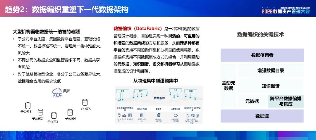 大型机构正面临数据统一纳管的难题。。。由于大型机构分支机构多、、业务体系庞杂、、数据平台建设缺乏统一规划,,导致无法在集团层面形成统一的数据管理与应用视图,,,,集团内数据共享和流通的成本较高,,,,难以整体激活数据的价值。。。有部分大型机构尝试通过统一物理基础设施来解决这一问题,,,,这种模式依赖于高层强有力的推动力,,,,且成本和代价较大。。。数据编织(DataFabric)是一种新崛起的数据管理概念,,目的是实现一种灵活的、、可重用的数据集成方法和服务,,,从而能够跨多平台支持不同的数据操作和分析任务。。。。核心思路是通过增强数据目录、、数据虚拟化、、、、主动元数据等技术,,将大型机构内多个数据平台进行逻辑集中管理,,避免物理集中带来的重复建设,,,,实现数据在大型机构内的统一纳管、、充分共享、、、融合分析与应用。。。