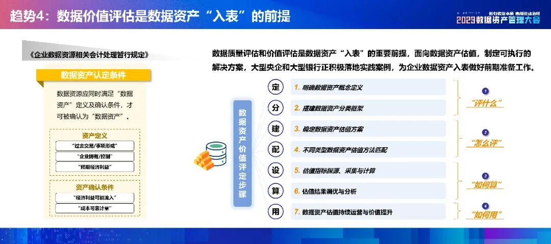 2023年8月,,,,财政部正式发布《企业数据资源相关会计处理暂行规定》,,并于2024年1月1日开始施行,,,指出现阶段数据资源会计处理应当按照企业会计准则相关规定执行。。。但是从数据资源到可以入表的数据资产,,,,中间还有很多的难点需要一一击破,,特别是从价值评估的角度,,,,质量因素、、、、应用因素、、、成本因素和法律因素都会对结果形成关键的影响。。。关于数据资产估值,,业界有很多探索,,,但还都是停留在方法论层面。。。。企业围绕数字化场景来进行非货币化的价值评估是比较现实的,,在非货币化评估的基础上,,,未来可以进行货币化的转化。。。。
