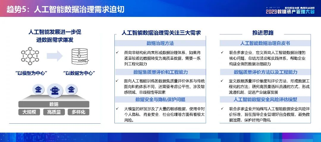 产业方面,,,近年来随着通用人工智能技术的飞速发展,,对于数据治理提出了新的需求。。。大规模、、、多样化、、、高质量的训练数据集是大模型建设的核心竞争力,,Meta最新发布的大模型的训练数据集达到了4828GB,,,,是5年前GPT-1数据集规模的一千倍。。吴恩达等科学家提出了以“数据为中心的人工智能”,,希望通过系统性地改进和增强数据集,,从而提高人工智能模型的准确性和可用性。。。。然而面向人工智能的数据治理体系刚刚开始发展,,,仍面临诸多挑战,,例如高质量数据集的获取、、、数据集质量的评价与提升、、、数据资源的知识产权保护、、、、生成内容的管理等。。。。这些都对数据治理的技术和方法论提出了更高的要求。。
