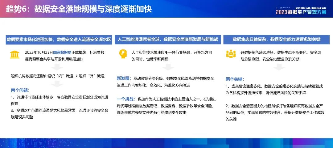 随着数据资源整合共享与开发利用进程加快,,数据安全进入了流通安全的深水区,,组织机构的数据资源将逐渐由在组织“内”流通向在组织“外”流通演进。。流通环节责任主体增多,,,流通频次和范围逐步增加,,,数据安全的风险暴露面也随之增加,,,需要面向责任主体和流通环节设计更细致的数据安全责任划分。。。其次,,,人工智能技术快速应用于各行业场景,,,在驱动数据分类分级、、、、数据安全风险监测等数据安全治理工作向智能化、、高效化、、精准化方向演进的同时,,,,也带来了新的数据安全问题。。。。第三,,,随着数据生态日益复杂,,,各种数据角色陆续进场,,,,安全风险愈演愈烈,,安全能力运营愈发关键。。。。数据安全运营能力的构建能够打破各组织既有数据安全产品间的壁垒,,实现策略的有效整合,,,是提升数据安全工作成效的关键。。