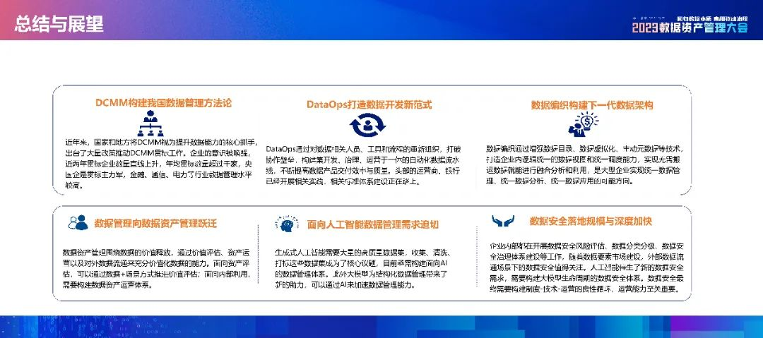 总结来看,,数据治理有六个大的发展趋势,,,,一是国内数据管理方法论的正在形成,,DCMM评估在各行业逐渐普及;二是数据管理与数据开发的融合正在进行,,,DataOps体系正当其时;三是数据编织构建下一代数据架构,,,极大提升数据管理效率;四是数据管理向资产管理跃迁,,,,资产评估和资产运营理论框架进一步细化;五是面向人工智能的数据管理需求迫切,,,,亟需构建面向AI的数据治理体系;六是数据安全落地规模与深度逐渐加快,,,需要关注数据流通安全、、、、人工智能数据安全以及数据安全运营等新的发展方向。。。。