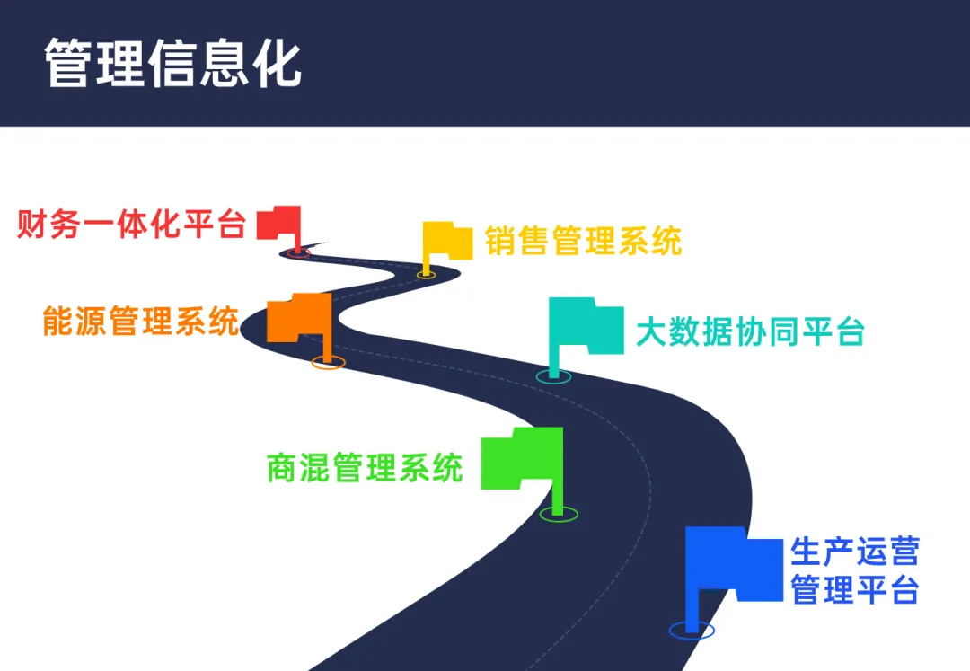 管理信息化方面:公司数字化转型起始于2008年,,为适应行业发展趋势,,,,根据企业发展和生产经营需要,,陆续建立了财务与供应链NC系统、、销售管理系统、、能源管理系统、、、大数据协同平台、、、、商混管理系统、、生产运营管理平台等主要业务信息系统,,,基本实现主营业务信息系统全覆盖。。。。