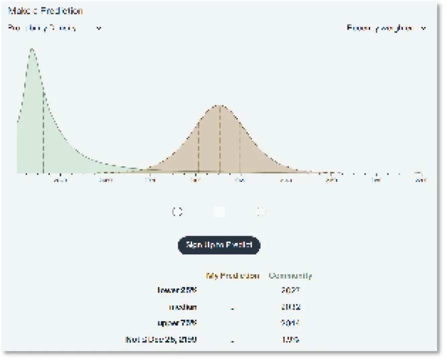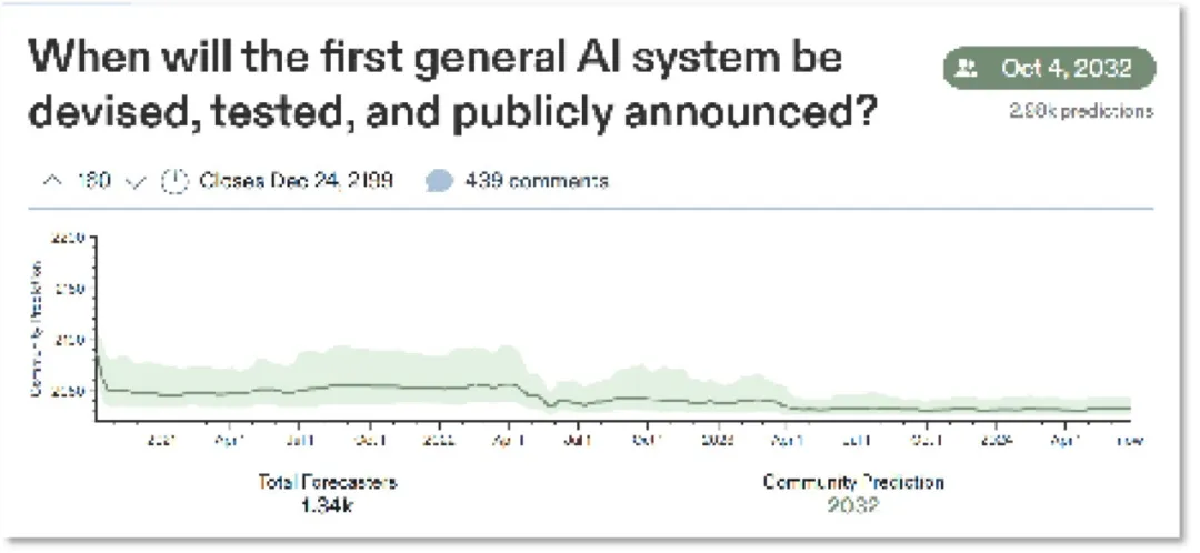 在2022年,,专家们预测,,,,人类水平的人工智能有可能在本世纪的60年代兴起,,可能性为50%。。然而,,Metaculus预测员社区的预测时间更早,,,他们预测的是40年代。。随着GPT-4的发布,,社区的预测时间开始提前,,,预计在2032年,,甚至最早在2027年,,,,我们就有可能实现AGI。。。
