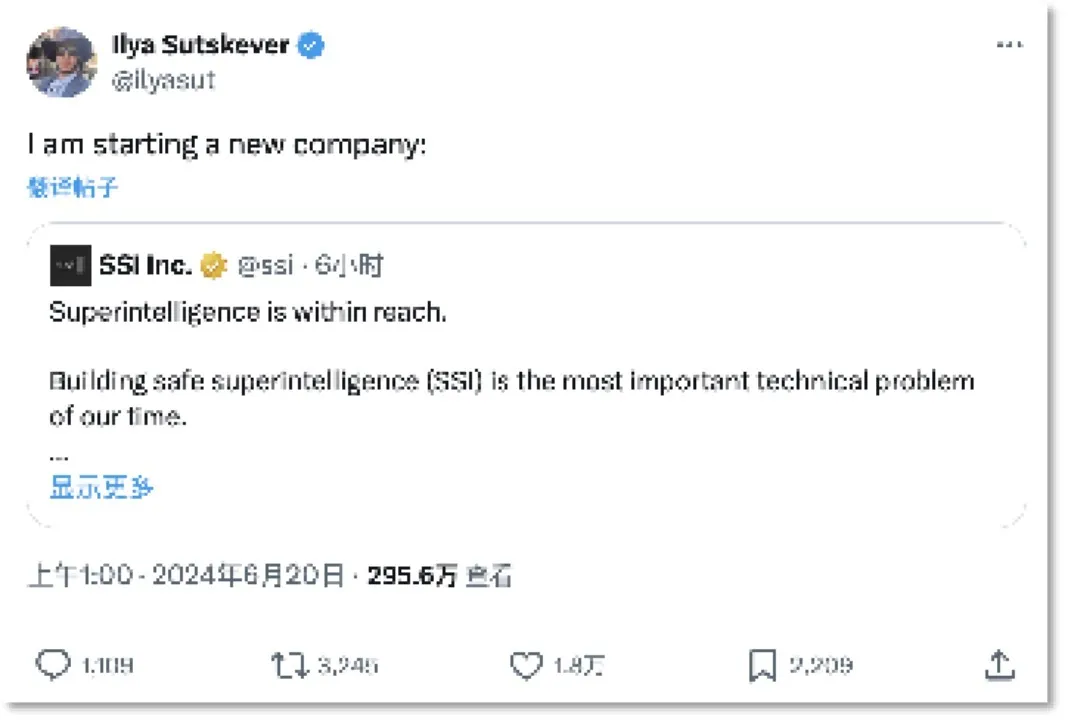 6月20日凌晨,,,,前 OpenAI 联合创始人、、、、首席科学家伊尔亚·苏茨克(Ilya Sutskever)在社交媒体上官宣成立新公司 SSI,,,,专注于安全超级智能。。
