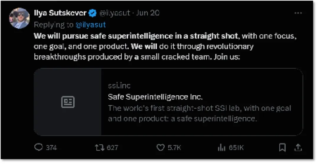 伊尔亚在SSI官方账号中官宣的“开场词”里表示:“超级智能已经触手可及。。。构建安全超级智能(SSI)是我们这个时代最重要的技术问题。。”