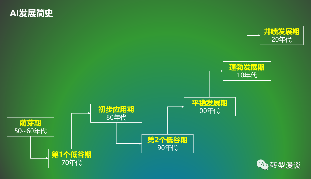 我简单整理了一下AI发展的历程,,,,如下图示: