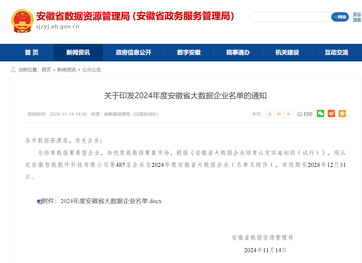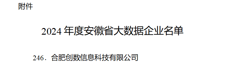 近日,,,,安徽省数据资源管理局公示了2024年度安徽省大数据企业名单,,经企业申报、、、、各市初审推荐、、、、专家评审、、、审查认定等程序,,,,合肥创数信息科技有限公司被认定为“2024年度安徽省大数据企业”。。。